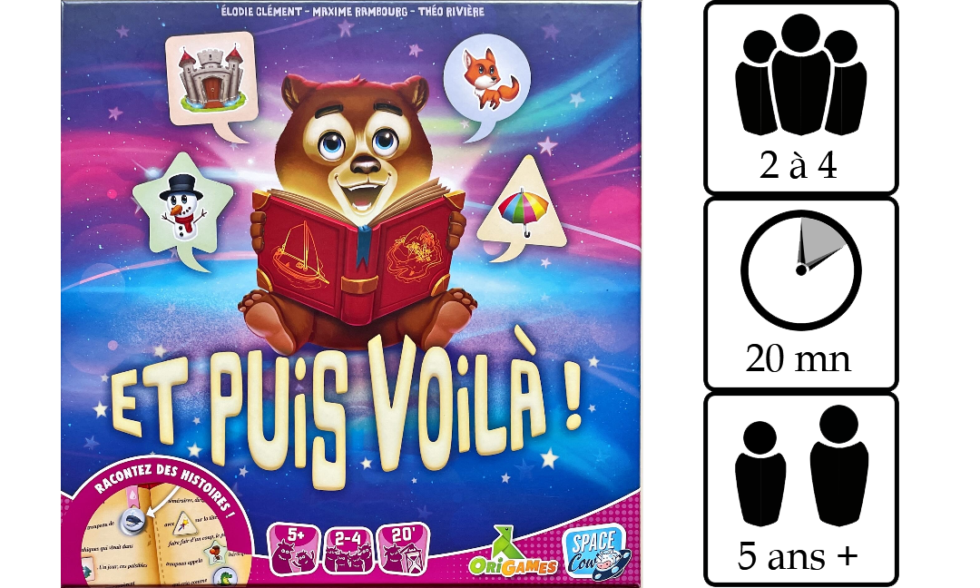 Et Puis Voilà ! est un société familial accessible dès 5 ans. Dans ce jeu de plateau et d’expression, parcourez un plateau de jeu et récoltez des jetons qui vous permettront de stimuler votre imagination et d’inventer une histoire pleine de découverte et de rebondissements.
