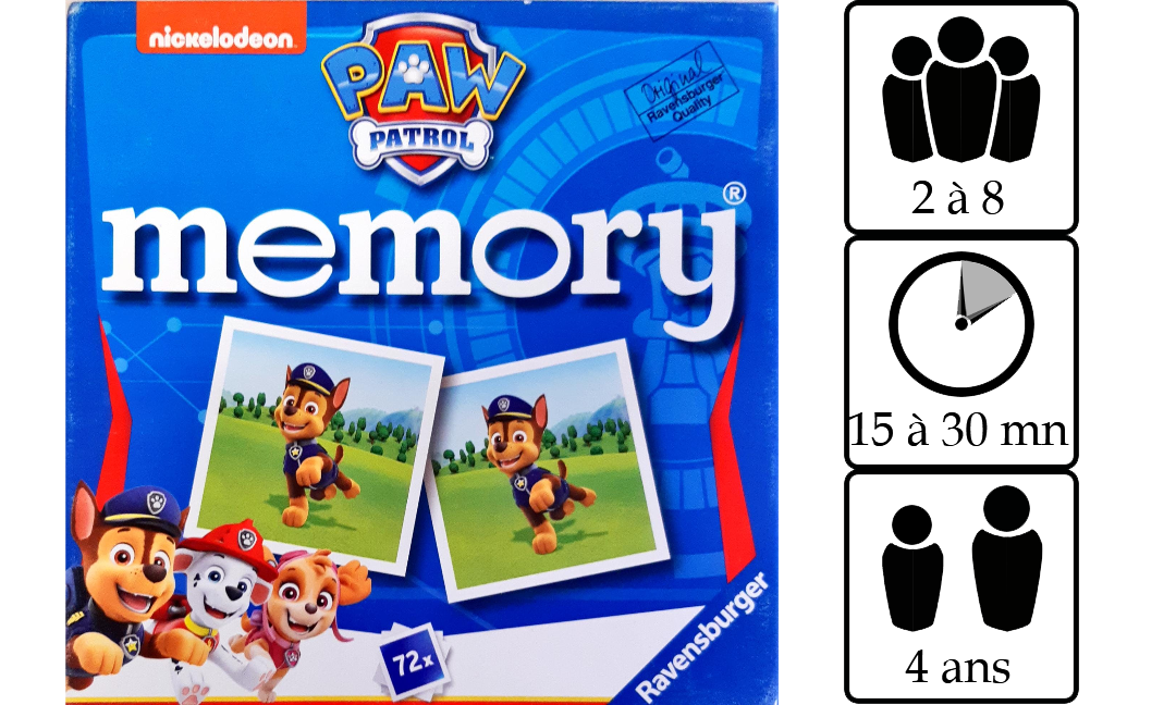 Le plus célèbre des jeux de mémoire avec tous les personnages de Pat’Patrouille ! L’enfant s’amuse à retrouver des paires d’images identiques, en développant son sens de l’observation et sa capacité de mémorisation.