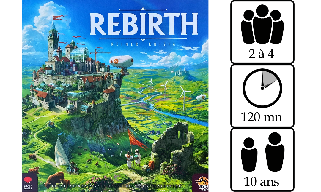 Rebirth est un nouveau jeu de tuiles de Reiner Knizia. Le jeu revitalise ce genre classique en combinant les mécanismes élégants de Knizia avec la construction d’un monde évocateur de Mighty Boards. Le résultat est un eurogame au gameplay fluide, situé dans un futur luxuriant et plein d’espoir.